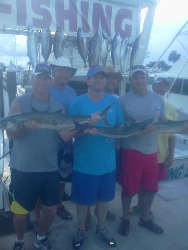 We put two plainers down, one with a 3 ½ blue reflector drone spoon and the other with a purple and brown sea witch in front of a double hook Bonito strip. For surface baits we had two Ballyhoos and two Bonito strips and a Ballyhoo daisy chain for a teaser. We trolled from one artificial wreck to the other, criss-crossing the reefs while all of the "brothers" took turns catching the fish. All in all, the anglers reeled in a total of 15 Bonitos, 4 Kingfish, 5 Tunas and 1 Barracuda.