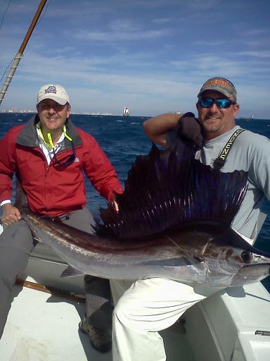 We stopped to purchase a dozen live Goggle Eyes from T&T Bait. Fifteen minutes from the dock, lines were in 120 ft. of water at the sea buoy in Fort Lauderdale FL. I put out two kites with two live Goggle Eyes from each kite and one live Goggle Eye from the outrigger. Our first fish came from the outrigger which was an 11 lb. Kingfish. As we sat patiently waiting for his arrival, water exploded on the left long. Sailfish in the air immediately!!!! But, the hook pulled. Well, Rodger, don't loose hope – with patience we will get another Sailfish.