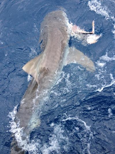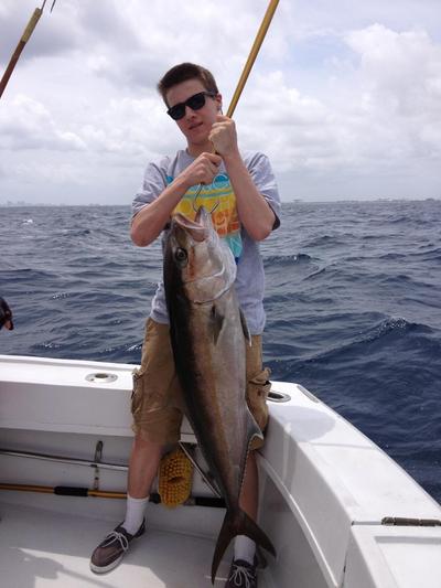 Winds today were out of the northeast at 12 mph, seas were running 3-4 ft. We stopped to purchase a dozen live Goggle Eyes from T&T Bait. Fifteen minutes later I was sitting on top of one of our 34 artificial wrecks in Fort Lauderdale located in 240 ft. of water. I thought it would be a good idea to start off with Aidan being our angler. We made a drop on top of the artificial wreck which produced a 35 lb. Amberjack, which put a smile on Aidan's face. From there I moved out to the Shark grounds, which is located in 350 ft. of water off of Fort Lauderdale. We set out one kite with two live Goggle Eyes, one Shark bait on the surface and one on the bottom. As Peter and his son were enjoying each others company, the deep rod bent over, and line started to peel off of the 80 International Reel. Peter jumped into the fighting chair, and after a 45 minute battle, he was rewarded with an 8 ft. Tiger Shark. Pictures were taken and the Shark was released to fight again.