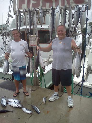 We put two #8 plainers down, one with a 3 ½ blue reflector drone spoon and the other with a pink and white sea witch in front of a double hooked Bonito strip. For surface baits we had 4 Bonito strips. With just two anglers on board the boat, no one had time to sit and take a break because the action was non-stop. We ended up with 12 Bonitos, 8 Kingfish, three Barracudas and four Tunas. A big "thank you" to Anthony for lending a helping to Mark, our mate.