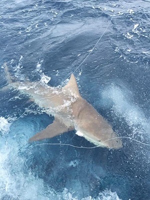 It was now time to do some Shark fishing. We headed out to 400 ft of water north of Fort Lauderdale and put out one surface, one midrange and one bottom Shark bait. The trap was set as Mike assumed his position in the fighting chair, while calling out for the Shark, "here Sharky Sharky". Forty-five minutes passed and then the bottom rod bent over. Hooked Up!!!! -as the Dacron line peeled off the 80 International Penn Reel. Dave, our mate, cleared the other rods as Mike played tug of war with the fish at the end of the line. Fifty minutes later a very healthy Dusky Shark surfaced as Dave wired him in for picture taking and release.