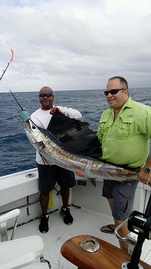 As we trolled the reefs the three young ladies and their fathers rotated catching a total of ten Kingfish, one Black Fin Tuna, three Bonitos and one 48" Barracuda. It was now time to try our luck at Sailfishing so we put out two kites with two live Goggles Eyes from each kite. As both families were talking about their good times while vacationing in Fort Lauderdale, a black shadow appeared on the left long – Sailfish!!! Bill and dorsal out of the water chasing the bait until he caught it – hooked up!!!! Sailfish on!!!! He tail-walked across the surface of the water. Keith was our angler and after a twenty-five-minute battle, Dave, our mate, wired the fish for picture taking. We reset again in the same location and shortly afterwards – right short – Sailfish!!! Joe was our angler on this one and subdued the Sailfish in the same time with the same results.