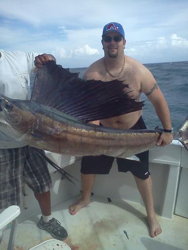Forty-five minutes later another Sailfish appeared on the left short. This Sailfish too swam up to the bait very slowly, and Jackson repeatedly splashed the bait. The color of the Sailfish changed to amber-brown, which indicates one thing – he is getting mad and he attacked the bait. All Billfish kill for a living – if you aggravate a Billfish enough, he will attack, whether he is hungry or not. As the Sailfish attacked the bait, he got hooked in the bill. The Sailfish came flying out of the water and screamed the line off the Shimano TLD 25. With experience on Eric's side, the battle was on, as his grandmother started taking pictures. By the time we cleared all lines, ¾ of the line was off the real. I backed down the boat to retrieve some line, and Eric did a great job bringing in the Sailfish in the rough seas. Pictures were taken of the 92" Sailfish.