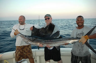 As always a great day of fishing on Lady Pamela. The day began a little slow as we were looking for some food fish. Blackfin Tuna had been pretty good in the early morning but we had no luck in the afternoon. We did get a couple good size Bonito and a 36 inch Cuda. We decided to switch over and do some kite fishing for sailfish and ran out a couple of deep lines as well. Before you know it we had a big fish on one of the deep lines. Within 5 minutes Capt. Pauley was yelling gold right, gold right. this was one of the kite lines. There was a large hammerhead after the bait.. I was already battling with a very large fish but still uncertain what it was. Capt. Pauley was pretty sure it was a shark as well. The hammerhead took the kite bait ( blackfin tuna). Now we had big fish on two lines. First mate Dave was doing his best to get the empty lines out of the way while helping me and my buddy Dave get our fish on the boat. After about 20 minutes Capt. Pauley could see my fish, it was a hog of a Scalloped Hammerhead. After an hour of fight Capt. Pauley pulled the big Hammer on the boat. A little over 8 feet long and roughly 250 lbs!! Once he was in the boat Dave was just about to get the other hammerhead in the boat when the line snapped. He did grab the leader so it was still a catch!! This shark was roughly 5 feet and 160 lbs. After all the excitement Dave put 2 kites out both with goggle eyes. In just a matter of a few minutes we had a large sailfish trailing one of the goggle eyes. He took the bait and the battle began. My buddy Dave from Youngstown Ohio was in for the fight of his life. After a grueling hour and a half battle Capt. Pauley and Dave had him in the boat. He was 7′ 6″ and about 175 lbs. Needless to say after all this action everyone was exhausted. A huge thank you to Captain Pauley and first mate Dave for making this a trip of a lifetime. I am already looking forward to my next trip with the Lady Pamela crew!!"