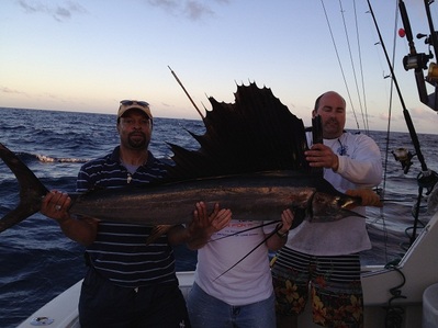 Our client Arthur had booked a fishing trip with us last June, but with a death in his family, he had to cancel. He paid for the trip and said he would come back. Well, Arthur called the other day and was ready to go fishing in the afternoon. We started the trip out by catching some bullet bonitos, as Arthur wanted to catch his own live baits. Amazingly, as we were catching the bonitos, a sailfish swam up and tried to eat one of the baits! Mate Pauli, the fastest guy you have ever seen, hooked a live bonito on a spinning rod and quickly cast it out. We hooked up the sailfish and it was off to the races. The fish dumped a lot of line, so I started backing down fast. Unfortunately, there was another boat trolling nearby and snagged our line, cutting the sailfish off. Pauli was fit to be tied, but there was nothing we could do. We went back to catching the rest of our baits and set up our spread. Around 2 hours into the trip we caught a 40lb kingfish, one of the biggest ones I have ever caught. It was a monster, and if we had been tournament fishing, it could have been a winner! We rounded out the trip by hooking up a monster sailfish that we got all the way to the boat. I sure was glad to see that our earlier sailfishing misfortune hadn't jinxed us for the whole trip!