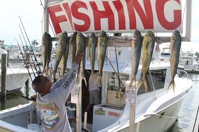 Adam and Joe had the all-day dolphin Thursday trip today. Joe said it was definitely an exhilarating all-day of catching dolphin today. They found weed lines from 650 foot of water all the way out to 980 feet and Joe said that he couldn't even get two lines out for most of the trip. They caught 60 Mahi-mahi on the 8 hour trip today and only got to bring home 12 Mahi- mahi the other dolphin where too short to keep. But it was great that there were 15 people and all 15 people got to catch 4 fish each that's what makes a good trip.