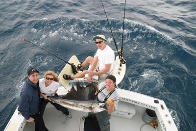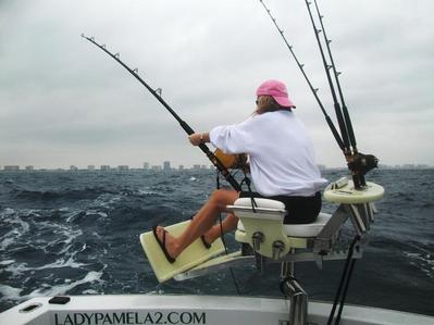 The Lady Pamela II crew has developed techniques that make daytime swordfishing a very successful sport as we've been able to catch them with great regularity. Research has shown that during daylight hours, swordfish hang out around 1,800 to 2,000 feet down looking to gnaw. Fresh squid and petite, whole bonito make for great bait when luring a beefy Broadbill up to the surface. The Lady Pamela II landed a 500 lb'er this month and it was one of the greatest fights we've experienced in Fort Lauderdale yet, it was man against fish.