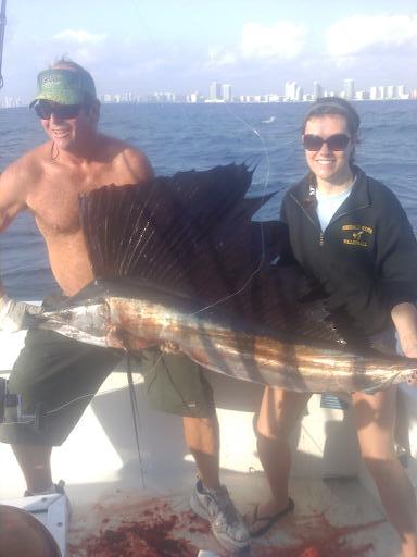 Sunny skies in Ft. Lauderdale South Florida. Winds out of the west northwest, 15-20 mph. Michael Kent and wife, Jean, son Ryan, and daughter Rachel from the south side of Chicago combined a business trip with a deep sea sport fishing charter on the Happy Day Today in Ft. Lauderdale South Florida.