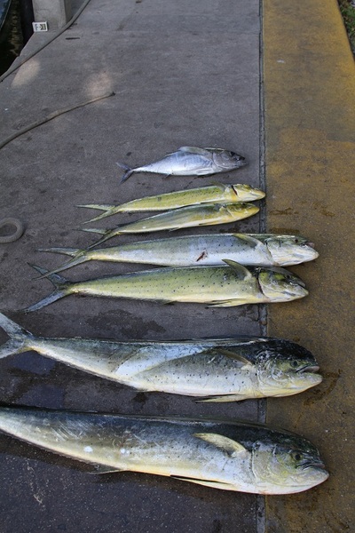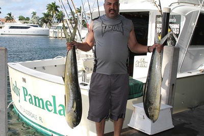 Jeffery and his wife from Washington, DC, fished the 1-5 p.m. charter this afternoon, aboard the Lady Pamela II. The weather was blowing 25 mph out of the northeast which made the seas a little big, but we could still go fishing. We had to go slow on the way out so there was plenty of time to rig a nice trolling spread. The baits were put out as soon as we cleared the inlet and once we got to 60 feet of water two 15 lb mahi-mahi slammed the lines. Captain Paul was yelling at the mate Peter to get Jeffery into the fighting chair. As we were fighting the two mahi-mahi Paul got a bite on the high line bait. This bait is trolled from high up on the fly bridge and it was a huge sailfish. Jeffery sure had his hands full while all this was going on but somehow he got it done! He was reeling in fish the whole entire trip. We ended up with 7 mahi-mahi and that huge sailfish. What a great trip.