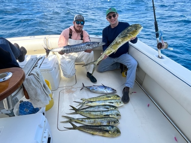 Chris and his wife booked a deep-sea fishing charter in Fort Lauderdale aboard the "Happy Day Today" and Top Shot Sportfishing Charters. We left the dock at Bahia Mar at 7 am and were offshore and fishing by 7:30 am. We are very fortunate to have fishing grounds just a few miles off the beach. The first mate had a spread of rigged naked Ballyhoo with two deep planner lines. We decided to head offshore to deeper water. The conditions were shaping up good with flying fish, floating debris and birds working in the area. I was on high alert for Mahi Mahi, constantly scanning the horizon for any signs of life. We trolled out to 600 feet of water, and as soon as we passed a group of seaweed, the rigger line came crashing down, and we had a Mahi on. What a great feeling when you see a nice fish jumping through the spread and the angler fighting the fish. After a good battle, the first mate reached out and gaffed the Mahi Mahi. We continued fishing the area making wider turns looking for anything floating. As we were heading back into 500 feet of water, I spotted a floating pallet. These floating objects will primarily have fish, but not always. This pallet had smaller bait fish swimming around it, a few triple tails on the corner, and I could see Mahi's deep in the water column. The first pass we made the deep planner line got a big strike, and Chris started fighting the fish reeling in a nice Wahoo. The first mate gaffed the Wahoo and put it in the fish box. We continued to troll around the pallet, and just about every other pass, we would hook a Mahi Mahi. This was steady action, and at the end of the charter, we ended up with 7 Mahi Mahi’s, one Wahoo and one Skip Jack Tuna. Every day is different out here fishing in Fort Lauderdale and can drastically change from one charter to the next. We just hope to find fish on every charter making decisions on what to target based on the conditions for the day.