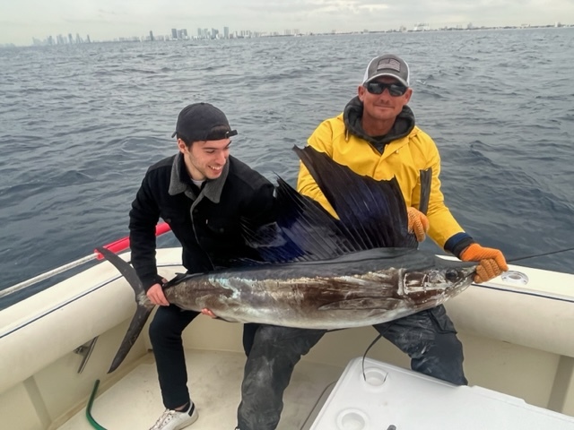 Emre, down from Chicago, chartered the "Happy Day Today" with his family. It was the day after Christmas and the temperature was a chilly 50 degrees. We decided to live bait fish in Fort Lauderdale along the drop off in 150 feet of water. First, we caught the live bait - these baits are called Bullet Bonita, and they will congregate on and around any structure, such as a sunken ship wreck, sea buoy or along the reef. As soon as we caught the live baits, the first mate rigged up the live baits; the spread of baits consisted of two long riggers, two short riggers and one down rigger line. Once the live baits were deployed, I fished them along the drop off, as shallow as 100 feet of water and out to 200 feet of water. Shortly after we had the spread of baits in the water, I could see a Sailfish chasing one of the live baits. After taking a few attempts on the live bait, the Sailfish ate the bait, and we had a Sailfish on, pulling drag. This is always a great way to start out a fishing charter, especially with one of the most sought-after bill fish. The angler fought the Sailfish and was able to reel the fish alongside the boat, where we removed the hook, pulled the fish in for a quick photo and released the Sailfish. We went back to fishing with the spread of live baits in the same general area. A sure sign that we are about to get a bite is when the live bait starts swimming frantically, and the rod tip starts vibrating. The down rigger rod will drop down, then pop up after the fish has eaten the live bait. The drag is set light, and the clicker starts to scream off. We started to fight the fish, and after a great battle, the fish came up, and the first mate gaffed a nice sized King Mackerel. At this time, we were out of live bait, so we made a quick trip back to the wreck and caught more live bait. Now with a full spread of live baits, I continued working down the drop off fishing in Fort Lauderdale. I could see an edge forming in 120 feet of water. This is where two currents meet, and bait fish, as well as predator fish, will travel along these edges. We lined up our baits along the offshore side of the edge, and it did not take long before a full grown 8' Sailfish exploded on one of the live baits. Rigger clip snapped out and the line started screaming off the reel. This fish started jumping out of the water, what looked like 10 feet above the water line. These fish put on an epic show, and after 30 minutes, we had the fish in the boat, hooks removed and safely back in the water set free.