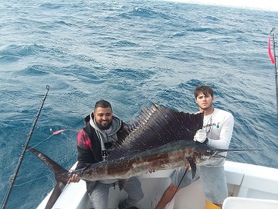 After that catch, we set up again with the two kites and four live Goggle Eyes. After a while, another explosion was heard on the right long line – a Sailfish jumped out of the water showing its magnificent color and doing 360 flips. The Sailfish ate the bait and started peeling off a lot of drag and sounding. Randy was first up as angler, then the rest of the anglers took turns on the reel, all contributing and catching the Sailfish. The Sailfish was brought to the side of the boat, the hooks were removed, pictures were taken and the 75 lb. Sailfish was released to fight another day. Congratulations to all the anglers for a job well done.