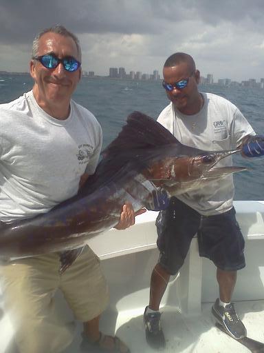 After purchasing a dozen live Goggle Eyes from T&T, I set out knowing that we had a two to three knot current heading to the north, so I headed south of Fort Lauderdale to a color change that I found in 200 ft. of water. We put out two kites, two live Goggle Eyes from each kite and one Shark bait down on the bottom. Nick was our first angler, as a Sailfish appeared on our left short kite, frantically chasing the Goggle Eye. After eating the bait, the Sailfish immediately came out of the water as he kept greyhounding away from the boat. Even at a distance, he looked very large, showing his spectacular strength and speed. We had to bring in the rest of our fishing lines and terminal tackle to chase the Sailfish down. Twenty minutes later, Nick brought the Sailfish to the side of the boat, as Jackson, our mate, brought him into the boat for picture taking. The Sailfish measured 91 inches and 60 lbs estimated weight.