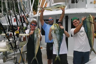 Bud and his wife Mary from Fort Worth, Texas joined Captain Paul and Mike aboard the Lady Pamela II for a deep sea fishing adventure in Fort Lauderdale, Florida. Bud fished many places with very little success; it all changed when he came fishing in Fort Lauderdale. Captain Paul led Bud and Mary offshore, catching live bullets (small bonitos) for bait. In the mist of bait fishing, a 20lb Bull Dolphin hooked itself to the spinner with 20lb test, talk about a nice fight. Mike pitched bait on another spinner and hooked a 15 lb'er. Shortly after, a 12 lb Mahi ate the left planner so we had 3 fish on at one time. After successfully boating all three Dolphin fish, there was a straggler Mahi still lingering behind the boat, but wouldn't eat any live bait. Mike tied a jig on, got it out there and started jigging fast. Mike made it happen and finally hooked the 14 lb Dolphin fish and Bud brought it in. Within 20 minutes, we landed 4 slammer size Mahi – Mahi in 120 ft of water right offshore Fort Lauderdale Beach, Florida.
