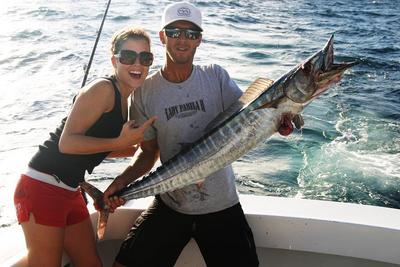 Today, Emmit and his family came sport fishing aboard the Lady Pamela II with Richard and I. Fishing started extremely slow. We trolled seawitches and mullet strips for about an hour, and all we got was a 5lb Barracuda. After we expertly released the Barracuda fish, we got a big bite in 480 ft of water. Richard (the mate) backed the drag off on the reel as Jessica stepped up to the plate to fight the fish. Richard got the leader and shortly after, I saw the 30lb+ Wahoo fish. Jessica fought the fish all the way to the transom, I gaffed it and he went into the fish box. What a beautiful fish! We didn't let the grass grow under our feet; trolling gear went right back in the water. A few more Barracudas ate along with some tasty Blackfin Tuna and a couple of Bonito fish.