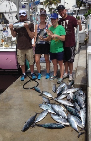 Our trip yesterday was the kind of trip that the need for talking wasn't needed. There was so much action and so many fish, our poor customers barely had time to catch their breath. In just over 2 hours of fishing, we caught over 40 Bonitos and 2 Kings. It was over an hour before we were able to get ALL our lines set, as each time we started putting something out, it got hit. The one time we did have everything out at once, all lines came down with fish on them. The group was having a blast and Justin was delighted with the help he got from all involved. The guys were bringing in the shock cords and boating the fish while Justin rigged and set lines.