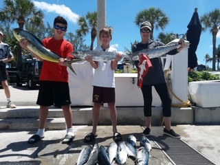 We started the fishing trip trolling the reef in 100 ft. of water south of Fort Lauderdale. As soon as we got the lines in the water, we hooked up with a Bonita. Our anglers were Lyle and Chris, and they took turns catching the Bonita one after another. We had very steady action for the first two hours of the charter. As soon as I found the school of fish, we worked offshore and inshore off of Fort Lauderdale keeping on top of the fish. Still trolling, we came across some Kingfish - they were feeding on the pink sea witch with a double hooked Bonita strip on the deep planner rod. I kept working the reef since the boys wanted to try for something big with teeth.