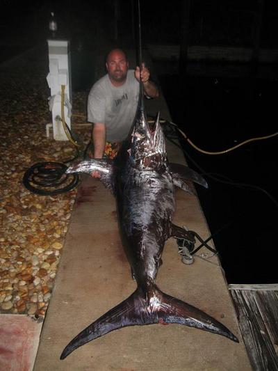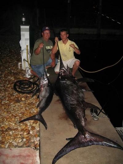 On Saturday night, David and his son set sail with Captain Paul and me for an all nighter Swordfish trip. A bit ironic, there was a Swordfishing Tournament taking place offshore. We left Lauderdale Marina around 5 PM and arrived to our destination around 7 PM, trolling our way to Swordfish grounds. As soon as we hit our spot, lines went in the water and the night began for us. Not even an hour after deploying our baits, David reeled in a 90 lb Broadbill. It was a pretty instant bite so lines went back down immediately. Before we knew it, we were hooked again. David's son grabbed the rod, got situated in the chair and started reeling. A 46 inch'er came alongside the boat and we released him for a future fight. At this point in the game, we weren't necessarily catching big fish, but we were getting the bite and we weren't complaining. Two long hours went by before we got another bite. After a 30 minute battle, David won with the Broadbill Swordfish at the transom. Three times a charm, right? David's son landed a beefy 300 lb'er to top off the night. Captain Paul and I haven't seen the Nighttime Swordfish bite go off like this in a long time. Too bad we weren't fishing the tournament; we probably would have won with that guy!