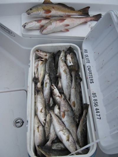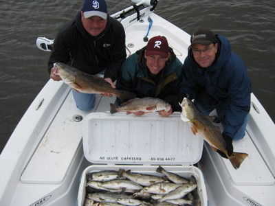 Despite the COLD temps outside, Dularge trout bite remains HOT!!!! Rick Woolsey joined me again today along with two of his superintendents Steve Basko, and Danny Cassell all from California. Rick can't get enough of our great trout bite down here!! The bite is so good it's hard to keep the trout off your line!!! Our first stop produced 67 trout and 10 reds (only 3 reds kept). Dead SLOW on the bottom is how the fish want it. When the bite slowed down I went check another location catching another 13 trout and 1 red-fish. Not a single throwback today as the fish were really nice with several hitting 2 pounds. Every fish caught on salt water holographic minnows (all colors producing). We called it quits at 12:00 with eighty trout and three reds so the guys could get the fish cleaned and showered up. Thanks guys for another splendid day of fishing.