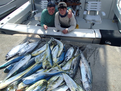 For those of you who live elsewhere and pursue other species know that the Mahi-Mahi is an extremely popular and very actively pursued fish here. These fish get large but most are from 4 to 7 pounds and are great fun on light tackle. Good eating as well. If we can't find that first fish of the day it can be a long day offshore, but find that first one, especially this time of year, and often things start to happen. Right now is high season and typically calm water and strong Gulfstream flow are commonplace. Pictured are Rich and his son Sean, accomplished out of state anglers who had a fun charter catching Mahi with us out there in 800- 850 feet on a flat calm day and bright sunny day.