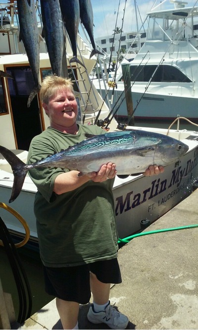 Summer has arrived and that means a lot of our Ft. Lauderdale Deep Sea fishing charters involve children of all ages. That 1st photo is of Donna holding her whopper Bonito. Never mind the Wahoo, Kings and Tuna on the fish rack, she likes that big "Bomber". This is a good time to get the kids offshore with good "action' fish such as Donna's fat Bonito being mixed in with other species along the edges of the reefs. Pleasant fishing weather but bring lots of sunscreen. Only a few scatttered showers.