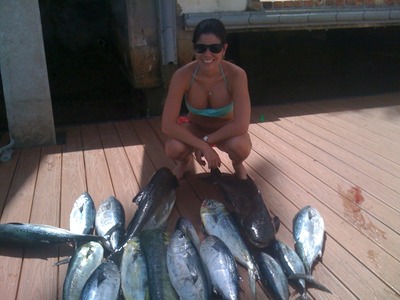 Pictured is Corrine who joined her boyfriend Chris, his dad Keith, Tripp and his friend James for a Ft. Lauderdale deep sea fishing trip aboard the Marlin My Darlin. As you can see there are a couple of Cobia joined by five Mahi-Mahi and some tunas and Bonito. Lets talk Cobia.