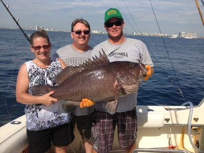 Yesterday Captain Darin and mate JJ had a 4 hour morning charter. The trolling has been nonstop action for the last few days, and today was no exception. They had a lot of rods bending with 28 bonito and even a few mahi-mahi. The mahi we have been catching have been small but they certainly are the best eating! Captain Darin also gave his anglers a shot at some big bottomfish on the offshore wrecks. They dropped live blue runners and speedos (redtail scad) on four shipwrecks before finally landing a nice size Warsaw grouper. It weighed in at 60 lbs. and left our anglers with some aching arms!
