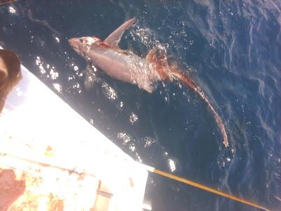 It was like Anne had a magic wand – once I told Anne and Amy to call the fish – "here fishie, fishie" – the pink and blue plainer rod bent over, the rod tip bounced up and down and the line exited the reel at an extremely fast rate. These were all indicators that we had a Wahoo hooked up. Anne had a tug of war with the Wahoo until finally Anne won and brought the fish to the boat. While Mitch, our mate, gaffed the Wahoo, I told everyone to step back and to be careful of its razor sharp teeth. Mitch could barely lift the 53", 43 lb Wahoo out of the water, while it thrashed back and forth. Wayne had a smile on his face, knowing that there was plenty of meat on that one fish for many meals.