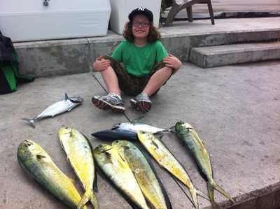 We had Max and his son Kadigan aboard the Marlin My Darlin for a ½ day Ft. Lauderdale fishing charter today. This was a special trip for young Kadigan as he loves to fish back home in Oklahoma in the sweet water with his dad and wanted to tangle with something a bit larger and stronger in the saltwater offshore here. They were here early and eager to get underway. Captain Chris wound up his conversation as to what Max would like to see for Kadigan, got them familiar with the boat, and fired up the Detroits. Brian piched the dock lines and the charter was off the dock and underway ahead of schedule. As you can see by the photo and smiling Kadigan these Mahi-Mahi were welcomed additions to his species captured list. While not the largest fish these Mahi were good fun, provided some good aerial displays and did pull pretty well and that was good enough to show that smile. We of course were hoping for a Sail for Kadigan but we didn't see one this charter, and the Mahi did provide good action. Live and rigged dead baits are both effective and the flying fish are getting hit hard by the Mahi. Always fun to watch.