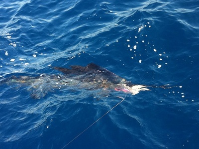 Paulie and I are just a few days back from giant bluefin tuna fishing. We had two guys with us this morning, Edward and John from New York. I was running the cockpit and it was good to get back down there for a change. Normally, I am just running the boat, so today was great for me. Paulie cut fresh bonito strips before we left the dock, and I sharpened all the hooks and got the baits ready on the way out. Just outside the inlet I put out a great looking bait spread. It wasn't long before we started getting a few kingfish, as well as a few blackfin tunas. We were trolling in 100 to 350 feet of water for that first hour. We even had a pesky sailfish on the right long rigger. I had a few shots at him before the fish finally faded away. I re-sharpened all the hooks and put all fresh baits back on top. It wasn't 15 more minutes before I had a sailfish on one of the top baits. Just as I was getting Ed into the fighting chair, my left planer tripped, and I hooked up sailfish number two! I cleared all the lines so Paulie could start to drive the boat on the two fish. It was a tricky little struggle, but it all worked out, as we landed both fish. We sure ended up having a fantastic day.