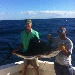 The Kingfish have slowed considerably the last few days. We are managing a few but they are tough. There are some Wahoo around as well but once again we expected more with this moon. An occasional really nice Mahi right up on the reef but you must be lucky to be on the X when these few fish move through, mostly in pairs. Positive news is that there are decent sized Vermillion Snappers biting pretty well in the slightly deeper water offshore. And we have caught a couple of Black Grouper pushing 20 pounds which are of course always welcome aboard the Marlin My Darlin. And there are a few Sailfish around as the nice sized catch and release fish in the photo by Johnathan on a half day fishing charter with his friend Jane.