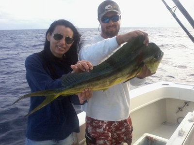 As you can see by the Mahi-Mahi in the photo with his captor Dounia (and 1st mate Brian) there are some decent sized Mahi available on our Ft. Lauderdale fishing charters. They continue to be scattered just off the reef line to roughly 700 feet of water and there continue to be tough fishing days mixed in with the better ones. This particular fish came out of 620 feet of water. As always look for the Hawks and Gulls, with fleeing Flying Fish a pinpoint locator.