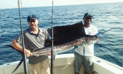 Nice Sail in the photo with Mike and 1st mate Dave. This fish was hooked on a trolled bait right along that reef line in 120 feet of water about a mile off the beach. An unusual number of Sharks along and just off that reef line as well with some being quite large. Hammerheads, Duskies and Bulls along with the usual Sandbars.