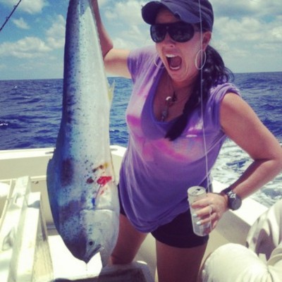 We did indeed find a couple of schools of the Mahi out on the 55 line in 850 to 900 feet of water. These fish were very skittish, moving very fast and only occasionally trying the Flying Fish that were in their line of travel. Even though we had difficulty in drawing bites we decided to remain in those depths as we saw fish there. We did manage a few and the large fish honor (Mahi) went to Brianne out of Dallas,Texas with Kristen (Mahi) right on her heels only a couple of pounds back. That is Kristen ( Miami )hoisting her Mahi fresh off the hook and headed for the ice and the fishbox. Her fish took a pink/blue/silver Stan Ruer tied Seawitch Bonito strip fished off the center rigger. That same presentation in the same position earlier drew a bite from what I felt was a small Blue Marlin. He passed up the 2 Marlin lures and 2 bridge teasers fished inside of the spread inside to try that one out in the back. Not that unusual, they often eat the last one to go by. Ran strongly away and then pulled off. Brianne's Mahi and the fish of the day ate a live Goggle Eye cast out on 20# spin. Also had a White Marlin try the right long rigger on this trip (Bonito strip/ Stan again midnight blue and white) and then went straight up in the air when he felt (and left) the hook. There are good fish offshore for sure and Brian and I also enjoyed our day in the deep.