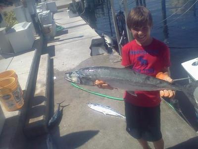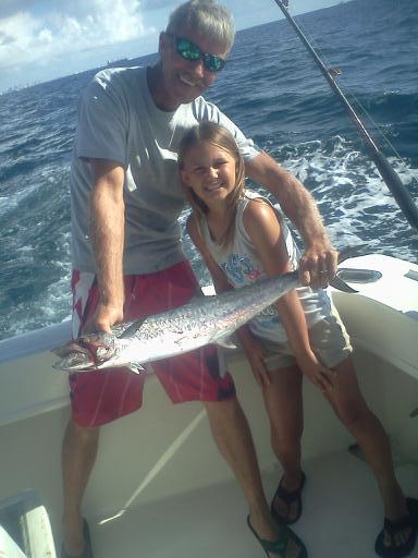 We put out a trolling spread in 120 feet of water just south of the #1 Sea Buoy @ Port Everglades Inlet and started to work back and forth across the reef line and to the south. The two kids did all the reeling this morning and mom worked the camera. We had several nice Kings this morning with Vanessa looking as if she would take big fish honors until Will caught the largest King late in the charter. Some fat Bonito also found our baits and gave their usual strong fight. Smaller Barracudas have been around and they were here again this morning.
