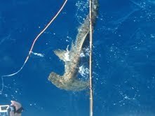 We went back to our same spot and reset. Again we settled down, talking about the strength of the fish that pulled the hook. I looked towards the kite and saw a dorsal fin circling the Blue Runner bait. I could see that the fish was a Golden Hammerhead Shark. The Shark attacked the bait, causing our 60 lb. test line to scream off the reel. Mitch cleared the rest of our fishing tackle and Tom again settled into the fighting chair. An hour and 50 minutes later, Mitch grabbed the leader on the estimated 250 lb Golden Hammerhead Shark. Cameras snapped away as the fish was subdued to the side of the boat and then was freed to fight again another day. Our angler with a smile from ear to ear signaled thumbs up to me.