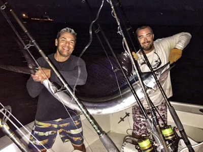Pictured is Tony and 1st mate Brian with a beautiful catch and release Sailfish on a Penn 950 spinner aboard Marlin My Darlin. Notice it's dark. This fish bit well after sundown and that's not very common at all. We caught a few Mahi-Mahi on this trip as well but they didn't come easily. A big Hammerhead caught that ate a live Bonito on a lighter leader targeting a Wahoo gave a good pull. Caught the kings one after another that morning prior to this afternoon trip. Next morning same guys, Jay, Vinny and Tony and only small sharks. They are regulars with us having fished aboard many times and sent me a note saying they again enjoyed their time with Chris, Brian and myself. But those two trips offshore are a good example of the swings in the action we are experiencing.