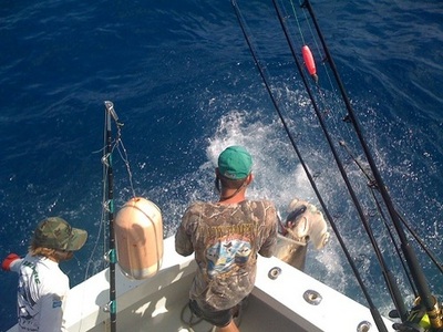 This afternoon we had Lady Pamela 1 with Capt. Keith and Randy and Lady Pamela 4 manned by Capt. Leo and Dave trying to out-do each other for company bragging rights. Both boats were out around 1PM, with LP1 starting out with trolling, and Leo on the LP4 sending up the kites. The surface baits did their job and it didn't take long before we had a nice sailfish hooked up. Like a ballerina with a pointy bill, the sailfish leapt and danced over the waves trying to throw the hook and get free. A half-hour later the crew had the fish next to the boat, attached a tracking tag and released it back to the depths. Leo and Dave also caught a few kings and a fat, 30-lb. blackfin tuna for later consumption. The Lady Pamela 1 trolled around and filled the box with bonito, king mackerel, and mahi-mahi before calling it a day.