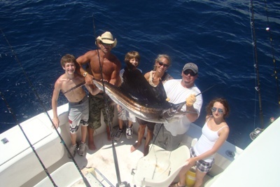 Aaron was in the chair in a flash but at first I think the sail fish was in control. This fish was all over the place at first dancing all over the surface than down deep just digging as if it was never going to stop peeling line off the reel. What a great back and forth tug a war but Aaron hung in there and at last got this nice 87 inch sail fish to the boat.
