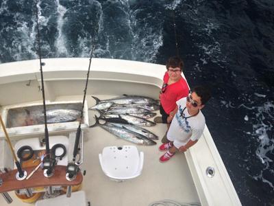 So the reefs it was for this ½ day charter. Peter and the boys were early, but we were ready so we headed out of the inlet ahead of most of the fleet. Bright sunny morning today with a very slight southeast breeze. No rain in sight but the air was heavy until the wind picked up. Typical morning here in Ft. Lauderdale this time of year. Very strong current flowing North with flat calm seas. Current makes things happen. Good fishing as we said earlier. Snapped this shot of Dillon and Nikko early on when 1st mate Dave pulled the Kings out of the ice to take a fish count to make sure we didn't exceed the legal limit and then back into the box and back to fishing. Caught a few more nice Kings, releasing some to stay at the limit along with more fat Summer Bonitos (aka Speed Perch). Horsepower to spare and a good tug of war for our Junior anglers Nikko and Dillon.