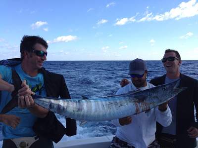 We have spoke often here recently about the number of Wahoo available on our Ft. Lauderdale fishing charters. Sails remain scattered on most days, Kings are erratic and Mahi in and out. Some good days and some tough ones. But it has and continues to be an exceptional Winter so far for the Wahoo and they keep hitting the fish box with regularity. Here is a super sized one caught aboard the Marlin My Darlin. Took a surface bait fished on a Shimano TLD 25. Beautiful South Florida day. Warm, sunny and a gentle sea. This fish was actually a wedding present, and here's the story.