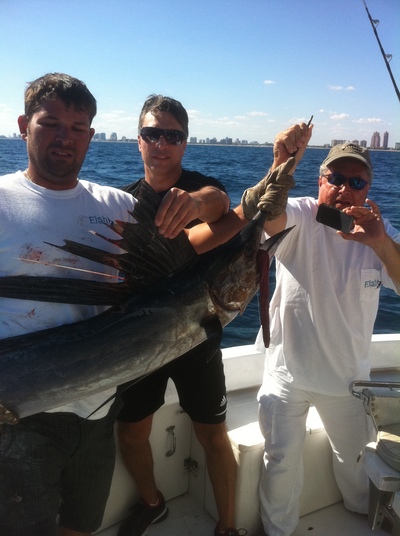 Today on their Fort Luaderdale Fishing Trip Dennis and Jim from Wisconsin did some kite fishing in search of Fort Lauderdale greatest gamefish. Fishing had been a little slow the last couple days so we were hoping to get lucky on this short three hour trip. It turned out to be Jim's lucky day as the sailfish came up and ate the perfectly presented live goggle eye fished out of the kite. We went ahead with the boat as the sailfish went airborne. After a twenty minute see saw battle Jim finally got the fish to the boat for a quick measurement and a clean release. Nice job Jim!