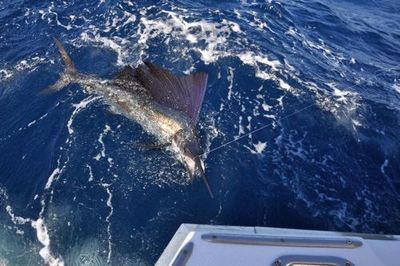 We started out with our kites and our live baits suspended from the kites in 125 feet of water. After a good 40 min with out a bite I slid the boat out deeper to 180 feet of water and after another 30 min with out a bite at last we got a bite and before we knew it this sailfish was dancing all over the place.