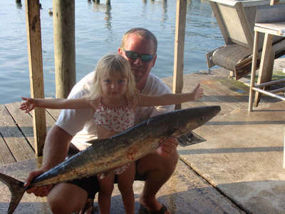 BRAGGING BOARD - On Monday on a family fishing trip our youngest granddaughter -- Kaitlyn Ward - age 3 started her kingfish career when she caught her very first king and it weighed in at 15 pounds. I am sure that she will be following her big sister --Savannah - age 8 and their dad - Rob into the SKA fishing tournaments. Our daughter in law - Tammy had a nice sailfish on but as the fish made a run for the boat it jumped across the bow of the boat and the line caught on a cleat and the line snapped. Last Wednesday afternoon Danny Maness & Rob Ward caught a nice pair of kings. Danny's fish weighed in at 44.4 pounds and Rob's weighed in at 39.8 pounds. Both were caught in live baits in 40 feet of water. Last week I had the results of the CENTRAL FLORIDA OFFSHORE FISHING CLUB in my report but had a problem with the pic. Hal Kersey caught the 38.5 king. The anglers in the photo are L to R - Hal Kersey, Hazel & Jimmie Brichetto and John Hooten. They were fishing on the REEL PARTY.