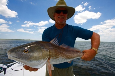 Thursday, Ritchie brothers, Indian River Lagoon. Scouted large portion of IRL looking for a redfish school or tarpon. Didn't find either, despite incredible weather. Found an area with some singles. Dave struck first, getting a slot red on a Merkin crab, his first redfish ever. Steve got another one on the same pattern a short time later, his first on fly.