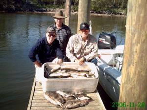 Fun day of fishing at the Beach today. David Bradshaw from Arizona, Craig Jeffcoat from MS, and Richard Aquilo from Da Parish were on board today. We made a stop by Campo's for some live shrimp before heading to Hopedale lagoon. We got on a good Trout bite right off the bat at our first stop picking up 72 pretty Trout throwing back 12 and 13 inch fish before they slowed down. Next it was time to drift. Tossed out the drift sock, and finished off our limits. It was a wonderful day to be on the water with a great bunch of fishermen. Our total for the day was 100 Trout (14"-18") and 14 Sheepshead.