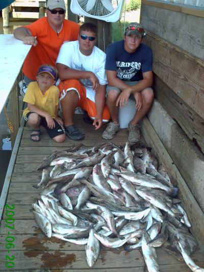 Fun day on the Beach today. Onboard today were Charlie Mascagni, his sons Charlie and John (8), and friend Matt Martinez. It felt more like late September this morning than June. There was a stiff NW wind and the air had a cool feel to it. We started off in Eloi and John was putting Trout in the boat from the start. His Zebco was the hot rod in the boat today, catching the first, the most, and the biggest. The wind died down a good bit as the morning went on. By this time we had 50 Trout and a bunch of Channels and Whites on ice. We made a move out into the Sound. The water was crystal clear and the Trout hungry. It was like looking into an aquarium with all the Spade fish swimming around and slashing Trout being brought up from the bottom. These were nice 1.5-3 pound Trout and in no time the box was full, limits reached, and all the bait gone. Total catch for the day was 125 Trout, 6 Sheepshead, 1 Pompano, 1 Flounder, several Channels and Whites, and 1 Grouper (released). It was a great day for all and they said it was the most fun Trout fishing they ever had.