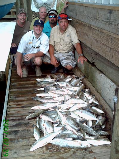 Fun day on the Beach today. Today's crew was from Cummings Mid South, Mike, Shawn, Tim, Dana, and Walter. After a stop by Campo's for bait we headed to the edge of the Sound. We picked up a few nice Trout at our first stop, but way too slow. From here we headed deep into the Sound. The SW wind made things a little bouncy with the tide ripping in against the wind. We got a steady bite of some nice Trout that ranged from 1 to 4 pounds with most solid 2s. Live shrimp on a Carolina rig was what they wanted. We had to use a ¾ oz sinker with the tide running so hard toady. We had some croakers, but they just would not take them today. The guys put their limits in the boat and when they stopped to eat some lunch I picked up a rod and put a few in the boat for me. The wind laid down as the morning went on, so with an over stuffed fish box and flat seas we headed to the house. Total catch was 135 Trout, 2 Drum, and 1 Pompano.