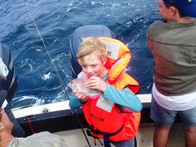We launched later to try avoid the rain and the wind but the forecast was out and so we had a wet and windy day fishing with some showers that passed by 3 times during the trip. Before we even launched my Costa Sunglasses fell off my head into the Marina and I had to dive down to get them as I was not going to accept losing them, and so my day started out wet, then the sun peaked out and the wind died and we thought what a glorious day this will be, we were wrong. We got out and set a spread and then the wind started blowing, fortunately it was a long period swell and so even in a strong wind the sea was comfortable with a big boat like Fat Girl. We trolled for about 2.5-3hrs but there was no sign of any game fish and so we came in to fish shallow in the 40m as the current was screaming. 1st down and 4 rods got bent and we got some Slinger and so the day went on with Slinger, Snapper, Soldier Bream, Trigger Fish and Rockod being caught. These boys out fished their parents by a long way and got a fair amount of fish with some good sizes and had a blast really enjoying the fishing. The highlight of the day was when the 2 youngest simultaneously had a good hook up, each landing nice sized Remora’s which made them work hard for their prize, it was a treat to watch them struggle and fight these fish up with all their might. In the end the whole family had a great day out with a lot of fun even though there was a little rain from time to time.