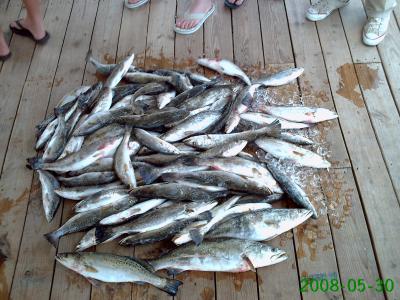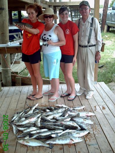 Fun fishing last Friday on the Beach. WT Myers, his daughter Judy, and granddaughters Temple and Hope were my guests for the day. We headed out to Bay Eloi and got on a slow, but steady bite of some nice Trout fishing with live minnows under a cork. We made a couple of moves catching Trout at each. The bite would start and stop, then start again. Temple had the catch of the day with a Bobtail Trout. Something bit its tail off and it had healed over. It looked more like a speckled eel than a Trout. They had a great time putting 75 Trout on ice.